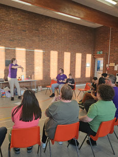 Warming up our bodies and voices, this often includes warming up our faces, practicing pitch and creating sounds